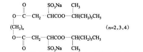 乙二醇雙子琥珀酸二仲辛酯磺酸鈉(GSS271)、1,3-丙二醇雙子琥珀酸二仲辛酯磺酸鈉(GSS371)、1,4-丁二醇雙子琥珀酸二仲辛酯磺酸鈉(GSS471)(結(jié)構(gòu)式如下,實(shí)驗(yàn)室自制。提純后測(cè)定,表面張力曲線無最低點(diǎn),說明不含高活性雜質(zhì)),實(shí)驗(yàn)用水均為二次去離子水經(jīng)亞沸重蒸。