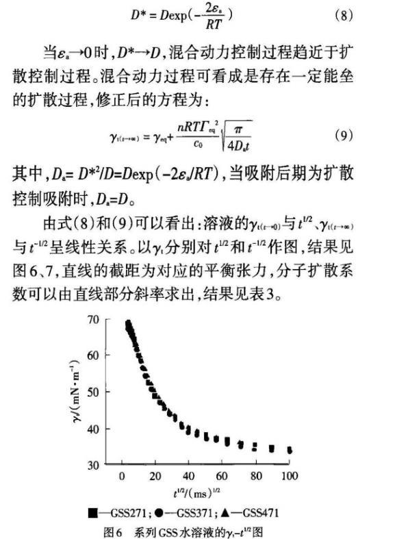 從表3可知,吸附初期GSS的擴散系數較吸附后期大2~3個數量級。表明GSS分子自本體溶液擴散到次表面的速度遠大于在氣液界面與次表面之間的交換速度,因為在吸附初期(t→0),新鮮表面不存在吸附勢壘,屬擴散控制吸附;吸附后期(t→∞),在氣液界面吸附的GSS分子由于相互作用產生的位能壘、離子頭基間的靜電斥力以及分子的定位重排等共同作用導致了混合動力擴散控制。