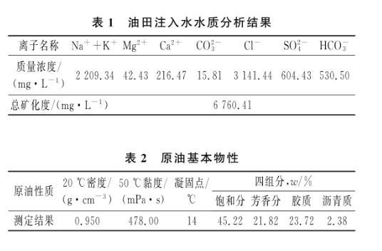 (1)主要材料。脂肪醇聚氧乙烯醚硫酸鈉、十二烷基苯磺酸鈉、十二烷基硫酸鈉,成都科龍化工試劑廠生產(chǎn);十六烷基二甲基甜菜堿、烷基糖苷APG1214,臨沂綠森化工有限公司生產(chǎn),上述藥品均為工業(yè)級。實(shí)驗(yàn)用水為油田注入水,水質(zhì)分析結(jié)果見表1;實(shí)驗(yàn)用油為X油田原油,其基本物性見表2。