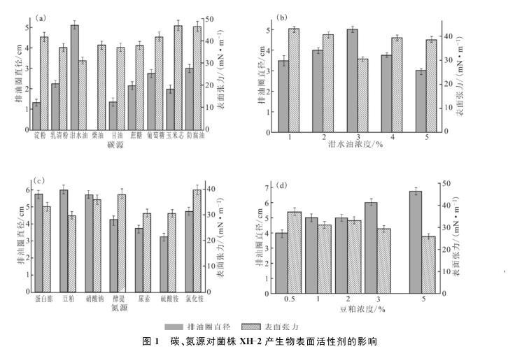 2.1不同碳、氮源對(duì)菌株XH-2產(chǎn)生物表面活性劑的影響(圖1)