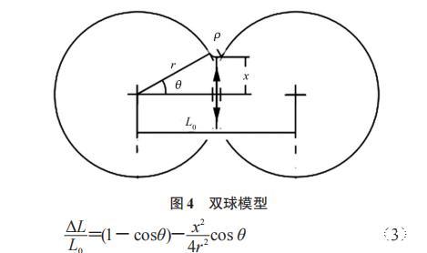 電子束熔粉與激光熔粉不同,因為電子束是以帶電粒子的定向運動產生的動能作為能量來源的,所以必須有導電回路才能不斷地轟擊工件。但粉末層是孔隙材料,導電性較差,因此在電子束接觸粉末的瞬間可能出現靜電潰散現象。為了確定熔粉初期的工藝模式,文章選用了雙球模型,計算不發生靜電潰散時的臨界線收縮量,結構模型如圖4所示。計算公式如式(3)。