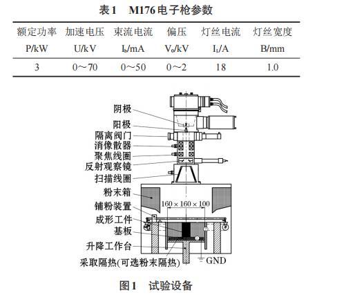 試驗設備為桂林獅達公司自制的THDW-3型電子束熔粉打印機,電子槍的型號為M176,電子槍真空度為5×10-2Pa,熔粉成形室注入氦氣之后的真空度為0.3 Pa。電子槍的參數如表1所示。成形設備如圖1所示。