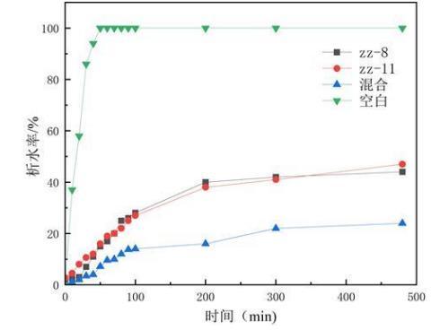 圖5是實(shí)施例1乳化性能測(cè)試中ZZ-11、ZZ-8、混合菌劑析水率曲線圖。