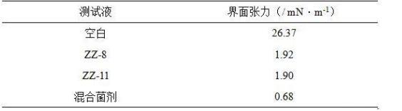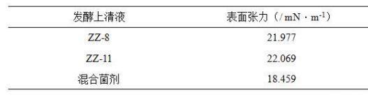 表面張力是洗油劑對原油洗脫能力的重要指標(biāo),數(shù)值越低、洗脫能力越強。測試結(jié)果顯示解淀粉芽孢桿菌(Bacillus amyloliquefaciens)ZZ-11和膠凍樣芽孢桿菌(Bacillus mucilaginosus)ZZ-8發(fā)酵上清液均能降低表面張力,混合菌劑發(fā)酵上清液的表面張力值更低。