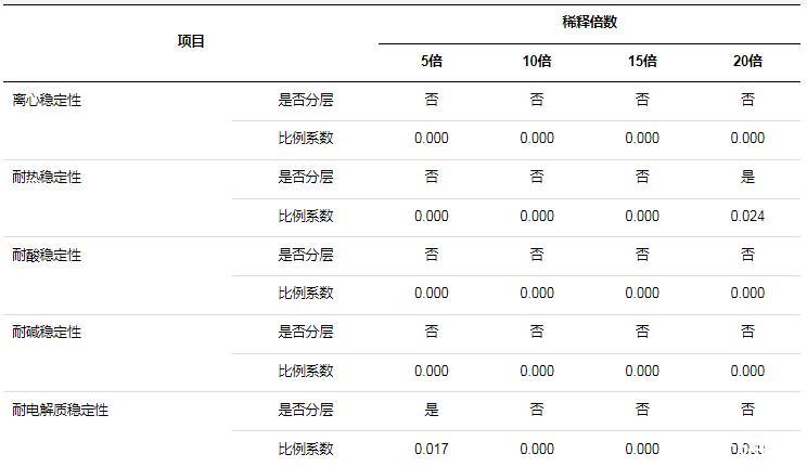 1)經(jīng)過稀釋后,耐熱穩(wěn)定性、耐電解質(zhì)穩(wěn)定性兩個(gè)測(cè)試項(xiàng)目雖然出現(xiàn)分層情況,但是比例系數(shù)均在0.1以下,氨基改性硅油柔軟劑保持較好的穩(wěn)定性;