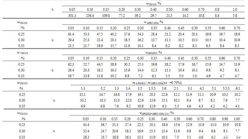 由表3可見,單一的YM-316溶液即可滿鋪在環己烷表面,表現出較強的鋪展性能。其中,最低鋪展質量分數為0.05%,此時鋪展時間為301.3s。隨著YM-316質量分數不斷增大,鋪展時間不斷減小,當YM-316質量分數達到1.0%時,鋪展時間降低至5.8s。另外,在YM-316分別與APG0810和APEC-10Na的二元復配體系中,當YM-316的質量分數為0.25%、0.30%和0.35%時,在質量分數為0.055%~1.0%的范圍內,隨著APG0810或APEC-10Na濃度的增加,其體系的鋪展時間逐漸縮短,這種趨勢在低濃度區域較高濃度區域要大;而在APG0810或APEC-10Na相同濃度下,隨YM-316質量分數增加其體系的鋪展時間也逐漸縮短。這些均表明YM-316與APG0810或APEC-10Na對環己烷表面的鋪展作用有良好相互促進效果,YM-316與APG0810和APEC-10Na組成的三元復配體系也是如此,且三元體系的鋪展性能比二元體系更好。氟表面活性劑的成本常常占到水成膜泡沫滅火劑成本的80%,APG0810和APEC-10Na作為一種良好的鋪展助劑,添加到含YM-316的滅火劑中,可在保持溶液原有鋪展性能的情況下,大幅降低YM-316的用量,從而大大降低水成膜泡沫滅火劑的成本。
