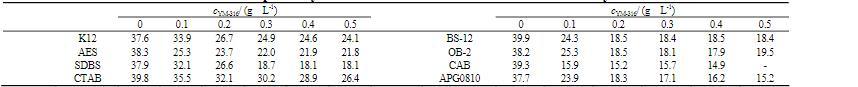 由圖1可知,隨著表面活性劑濃度的逐漸增加,溶液的表面張力顯著降低,當濃度增加到一定值時,表面張力下降到較低值,當濃度繼續增加時表面張力變化逐漸趨于平緩。YM-316氟碳表面活性劑水溶液的臨界膠束濃度為2.5×10-4mol/L,臨界表面張力為15.3 mN/m。