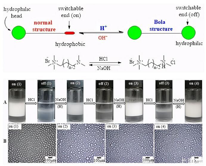 圖1新型智能型表面活性劑(N+-16-N)的結構和pH-響應原理及其(0.06mM)與微量(0.01wt.%)納米氧化鋁顆粒協同穩定的新型(oil-in-dispersion)乳狀液的pH響應性(每次乳化用新油,水相重復使用)。