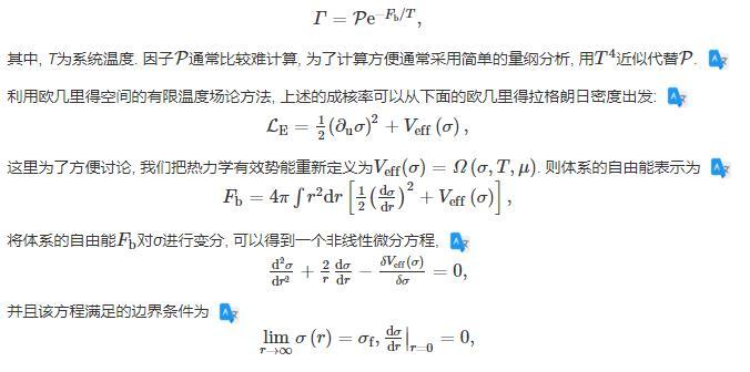 在偽真空的環(huán)境下,大小不一的真真空泡泡,由于量子漲落和熱漲落隨機(jī)出現(xiàn)并消失,直至泡泡的半徑大于等于臨界半徑,然后這些泡泡就會(huì)一直膨脹下去,完成一級(jí)相變的相變過程,并把多余的體系自由能以相變潛熱的形式釋放到環(huán)境中。基于這個(gè)機(jī)制,單位時(shí)間單位體積的臨界泡泡成核率可以表示為