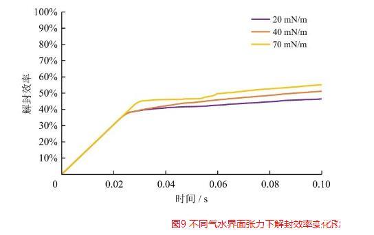 氣水界面張力對注氣解封過程及流體微觀分布具有較大影響。建立70 mN/m、40 mN/m和20 mN/m等3種不同的氣水界面張力的模型,分別代表潤濕反轉(zhuǎn)劑作用后的氣水界面張力變化情況,研究不同氣水界面張力條件下流體微觀分布演化特征和解封效率差異性(圖9)。從圖中可以看出,隨著氣水界面張力的降低,毛細管力減小,大幅降低注氣解封過程流體流動阻力,促進了氣相優(yōu)勢通道的快速形成,說明氣水界面張力的降低有助于減小解封壓力,實現(xiàn)水封氣藏的快速解封;但同時氣水界面張力的降低,會導(dǎo)致氣體微觀波及效率降低,部分區(qū)域仍具有較高的含水飽和度,解封效率略微降低。因此,隨著潤濕反轉(zhuǎn)劑濃度的增加,潤濕反轉(zhuǎn)劑能夠降低氣水界面張力,對解封過程產(chǎn)生明顯的促進作用,但解封效率會略微降低。