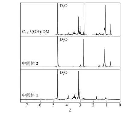 圖1、圖2為雙子表面活性劑的紅外光譜圖。由圖1可知,目標產物通過中間體1和中間體2的對比已反應合成,目標產物C12-3(OH)-DM中3357cm-1為—OH的伸縮振動吸收峰,3010cm-1為不飽和雙鍵氫C=C—H的伸縮振動吸收峰;2921cm-1、2851cm-1為飽和甲基和亞甲基C—H的伸縮振動吸收峰;1726cm-1為酯基上C=O鍵伸縮振動吸收峰;1637cm-1為C=C的伸縮振動吸收峰;1472cm-1為C—N的伸縮振動吸收峰;1380cm-1、1326cm-1分別為甲基和亞甲基的彎曲振動吸收峰;1262cm-1為酯基上C—O的伸縮振動吸收峰,這些峰的存在說明紅外圖譜與C12-3(OH)-DM分子式中的基團一一對應。圖2顯示,3種雙子表面活性劑均已合成。