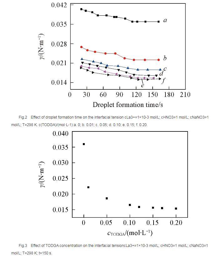 考察了以正辛烷作稀釋劑時,不同TODGA濃度體系的界面張力隨液滴形成時間的變化情況。從圖2可以看出,對于不同TODGA濃度(包括不添加TODGA)的體系,界面張力均隨著時間的延長逐漸降低,約在120 s時基本達到界面吸附平衡,可以認為萃取過程在此時間段內基本完成;液滴形成時間相同時, TODGA濃度越大,體系的界面張力值越小,即不同濃度下達到界面吸附平衡的濃度不同,表明不同TODGA濃度體系界面物種成分不同。