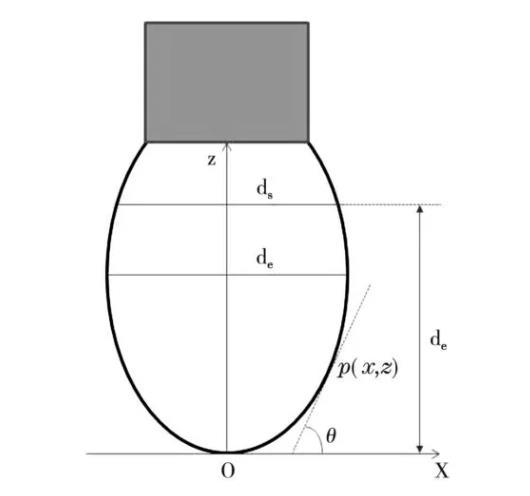 對于圖1所示的液體懸滴,以懸滴頂點O為坐標原點,該點處的水平切線為x軸,懸滴輪廓的對稱軸為z軸,建立平面直角坐標系。設(shè)懸滴輪廓上任意一點p的坐標為(x,z),p點處切線與x軸的夾角為θ。