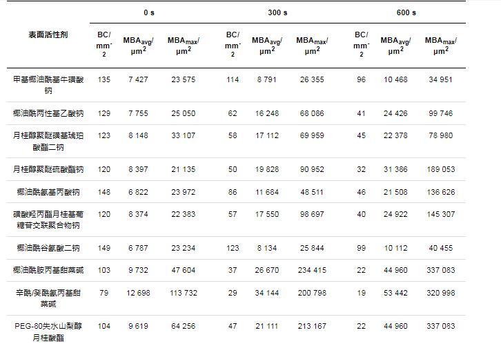 表面活性劑的泡沫形態(tài)數(shù)據(jù)如表3所示,包括10種表面活性劑溶液在產(chǎn)生最大泡沫體積之后的0,300和600 s時(shí)的泡沫密度(BC)、平均氣泡面積(MBAavg)和最大氣泡面積(MBAmax);同時(shí),選取了5種具有代表性的表面活性劑,對(duì)其泡沫形態(tài)進(jìn)行拍照觀察,如圖3所示。最初,所有陰離子表面活性劑的氣泡都非常小且均勻,其中椰油酰谷氨酸二鈉、椰油酰氨基丙酸鈉和甲基椰油酰基牛磺酸鈉這3種氨基酸表面活性劑的平均氣泡面積分別為6 787,6 822和7 427μm2;而兩性和非離子表面活性劑的平均氣泡面積較大,其中椰油酰胺丙基甜菜堿為9 732μm2、辛酰/癸酰氨丙基甜菜堿為12 698μm2、PEG-80失水山梨醇月桂酸酯為9 619μm2。在600 s時(shí),大多數(shù)陰離子表面活性劑氣泡的平均面積在30 000μm2以內(nèi),椰油酰兩性基乙酸鈉的平均氣泡面積為24 426μm2,其余兩性和非離子表面活性劑的平均氣泡面積均大于40 000μm2,其中辛酰/癸酰氨丙基甜菜堿達(dá)到53 442μm2。以上結(jié)果表明,甲基椰油酰基牛磺酸鈉、椰油酰谷氨酸二鈉具有較好的泡沫形態(tài)穩(wěn)定性,600 s后其泡沫密度和氣泡面積變化相對(duì)較小,而椰油酰胺丙基甜菜堿、辛酰/癸酰氨丙基甜菜堿、PEG-80失水山梨醇月桂酸酯的泡沫密度和氣泡面積變化相對(duì)較大,其泡沫形態(tài)穩(wěn)定性較差。