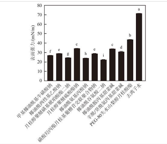 將10種表面活性劑的去離子水溶液(pH=6.0)進(jìn)行表面張力測(cè)定,結(jié)果如圖1所示。去離子水的表面張力為71.81 mN/m;所有表面活性劑均可顯著降低去離子水的表面張力,其中PEG-80失水山梨醇月桂酸酯降低表面張力的能力最差,為43.73 mN/m;月桂醇聚醚硫酸酯鈉和椰油酰胺丙基甜菜堿水溶液的表面張力無顯著差異,分別為34.14和33.87 mN/m;辛酰/癸酰氨丙基甜菜堿水溶液的表面張力為30.54 mN/m;椰油酰兩性基乙酸鈉和磺酸羥丙酯月桂基葡糖苷交聯(lián)聚合物鈉水溶液的表面張力無顯著差異,分別為28.88和28.71 mN/m;甲基椰油酰基牛磺酸鈉水溶液的表面張力為26.74 mN/m;月桂醇聚醚磺基琥珀酸酯二鈉水溶液的表面張力為24.16 mN/m;椰油酰氨基丙酸鈉水溶液的表面張力較低,為23.84 mN/m;椰油酰谷氨酸二鈉水溶液的表面張力最低,為22.08 mN/m。