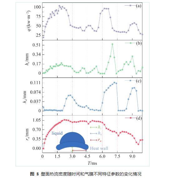 從圖7可以看出,相對(duì)于壓強(qiáng)的變化情況,壁面的熱流密度與氣膜的相關(guān)性更強(qiáng),氣膜厚度的變化會(huì)引起熱流密度的變化。圖8是液滴撞擊過程中壁面平均熱流密度及氣膜不同特征參數(shù)隨時(shí)間的變化情況,圖8(a)是壁面平均熱流密度,可以看出,平均熱流密度的變化情況受液滴中心氣膜厚度影響較大,在前期鋪展階段中心氣膜厚度出現(xiàn)明顯波動(dòng)時(shí)熱流密度也相應(yīng)波動(dòng),在液滴收縮階段,熱流密度變化明顯與頸部氣膜厚度成正相關(guān);圖8(b)是液滴中心氣膜高度,中心氣膜高度波動(dòng)最為劇烈,在液滴撞擊前3 ms內(nèi),即液滴鋪展階段先伴隨不穩(wěn)定波動(dòng)升高再保持穩(wěn)定,當(dāng)液滴開始收縮時(shí)出現(xiàn)大范圍的波動(dòng);圖8(c)是液滴頸部氣膜厚度,頸部與中心點(diǎn)通常為液滴底部氣膜厚度最薄點(diǎn),也是熱流密度峰值點(diǎn);圖8(d)是液滴的頸部半徑長(zhǎng)度,它的變化規(guī)律與液滴鋪展情況相似,且可以用來(lái)表示液滴與壁面的有效換熱面積。相較其他兩項(xiàng)特征參數(shù)而言,液滴中心氣膜厚度顯然對(duì)熱力學(xué)能具有更高的影響。