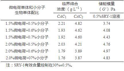 室內(nèi)合成實(shí)驗(yàn)研究發(fā)現(xiàn),微電荷單體對(duì)降低CAC2貢獻(xiàn)較大,用量優(yōu)選為1.5%~2.5%,而小分子生物單體對(duì)降低CAC1貢獻(xiàn)較大,用量優(yōu)選為0.5%~0.7%,兩種單體共同作用下臨界締合濃度降低和黏彈性提高顯著,最優(yōu)結(jié)果見表3。可見當(dāng)采用2.0%微電荷單體+0.6%小分子生物單體組合時(shí),溶液具有較強(qiáng)的黏彈性,此時(shí)SRY-1的CAC1,CAC2分別為1.79 g·L?1、3.89 g·L?1,對(duì)應(yīng)SRY-1用量接近0.18%、0.4%。