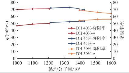 室內(nèi)通過控制水解度(40%~50%)制備了一系列的SRY-1樣品,配制成濃度為0.5%的溶液,測試聚合物不同分子量下的表觀黏度(30 min)和降阻率(Q=45 L/min)。如圖2所示,在優(yōu)化的水解度范圍內(nèi),SRY-1分子量均在1000萬以上,水解度越高,分子量越高;溶液表觀黏度隨分子量的增大而增大,但降阻率隨分子量的增大呈現(xiàn)先緩慢升高后較快降低的趨勢。主要是因?yàn)榉肿恿吭礁撸貜?fù)單元數(shù)愈多,分子間越易形成鏈纏結(jié),分子鏈具有更大的流體力學(xué)體積,溶液黏度增大,當(dāng)增大到一定范圍,溶液黏彈性受到影響,降阻率就隨之下降。由數(shù)據(jù)對(duì)比,SRY-1分子量控制在1200~1300萬為宜。