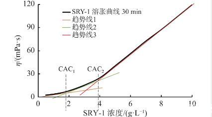 據(jù)研究表明,締合聚合物溶脹經(jīng)歷3個(gè)階段,分別對(duì)應(yīng)了兩個(gè)黏度突變的點(diǎn),即臨界締合濃度CAC;通過繪制聚合物溶液黏度-濃度曲線,擬合分析得到3個(gè)階段的趨勢線及公式,兩兩相交的點(diǎn)取絕對(duì)值即為臨界締合濃度值,計(jì)算得CAC1,CAC2,如圖3所示。根據(jù)曲線可以看出,在CAC1之前,溶液黏度增長趨勢較緩慢,當(dāng)達(dá)到CAC1并向CAC2過渡時(shí),溶液黏度增長相對(duì)加快,超過CAC2后,溶液黏度迅速增加,1.0%用量下終黏可達(dá)110 mPa·s以上。