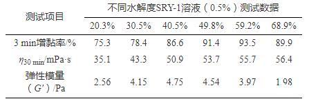 數(shù)據(jù)顯示,隨水解度增大,SRY-1增黏率和表觀黏度都顯著提高,但水解度超過60%后,增黏率又有所降低,SRY-1溶液G'呈現(xiàn)先增大后減小的趨勢。分析認(rèn)為:在一定范圍內(nèi),由于水解度增大,分子鏈更加伸展,分子間共價(jià)鍵作用更易形成彈性微觀網(wǎng)絡(luò)結(jié)構(gòu),彈性模量G'增大;隨著水解度繼續(xù)增大,聚合物分子流體力學(xué)體積持續(xù)增大而很難交叉纏繞,黏性行為明顯,彈性減弱,表現(xiàn)為彈性模量G'減小。因此水解度過度提高會(huì)造成增黏率下降,溶液黏性增強(qiáng),彈性降低的負(fù)面影響。由數(shù)據(jù)可知,SRY-1水解度為40%~50%時(shí),SRY-1的3 min增黏率可達(dá)90%以上,溶液黏彈性最為顯著。