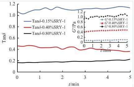 黏彈性是指流體對(duì)施加外力的響應(yīng),表現(xiàn)為黏性和彈性雙重特性,通常用G′表征彈性模量,G″表征黏性模量,而G″與G′的比值記作Tanδ,用于表征流體黏彈性的強(qiáng)弱:隨Tanδ由大到小變化,流體黏彈特性越明顯,Tanδ>1時(shí),流體流動(dòng)性強(qiáng),Tanδ<1時(shí),流體結(jié)構(gòu)性強(qiáng)。對(duì)0.15%、0.4%、0.8%SRY-1的壓裂液進(jìn)行了黏彈性測(cè)試(利用RS6000流變儀錐板測(cè)試系統(tǒng)進(jìn)行定頻率定應(yīng)力掃描實(shí)驗(yàn),測(cè)試得到的彈性模量G′、Tanδ變化情況見(jiàn)圖6所示。