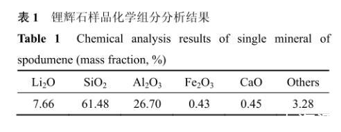 本試驗所用的鋰輝石來自四川某鋰輝石礦,試驗礦樣分別經(jīng)過手選、剛玉破碎機破碎、清洗、瓷球罐研磨、篩分出0.038~0.074 mm和<0.038 mm兩個粒級的鋰輝石分別作為分析測試和單礦物浮選試驗的樣品,其化學組成分析(XRF)結(jié)果如表1所列。