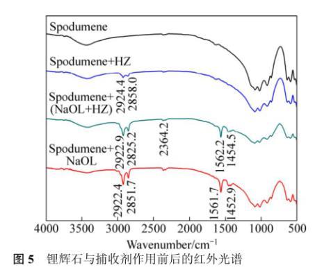 鋰輝石與不同藥劑作用前后的紅外光譜如圖5所示,鋰輝石與NaOL作用后在2922.4和2851.7 cm?1波長(zhǎng)處都有峰存在,在此波長(zhǎng)范圍內(nèi)為甲基(—CH3)、亞甲基(—CH2—)的伸縮振動(dòng)共振峰,表明NaOL在鋰輝石表面有吸附作用。在1561.7和1452.9 cm?1波長(zhǎng)處有新峰產(chǎn)生,其中1452.9 cm?1波長(zhǎng)處為亞甲基(—CH2—)的變形振動(dòng)共振峰,1561.7 cm?1處為油酸鋁的吸收峰,表明NaOL在鋰輝石表面生成了新的物質(zhì),新峰產(chǎn)生表明這種吸附作用是化學(xué)吸附。鋰輝石與HZ作用后在2924.4和2858.0 cm?1波長(zhǎng)處都有峰存在,在此波長(zhǎng)范圍內(nèi)為甲基(—CH3)、亞甲基(—CH2—)伸縮振動(dòng)共振峰,表明HZ在鋰輝石表面有吸附作用。而鋰輝石與HZ藥劑作用后,光譜圖譜中沒(méi)有新峰產(chǎn)生,表明這種吸附不是化學(xué)吸附,HZ是一種非離子型捕收劑,它在鋰輝石表面的吸附不是靜電吸附,結(jié)合Zeta電位結(jié)果分析推測(cè)這種吸附可能是氫鍵作用。鋰輝石與(NaOL):(HZ)=5:1組合捕收劑作用有新的峰產(chǎn)生,但仍是和鋰輝石與NaOL作用后的吸收峰類似,表明捕收劑經(jīng)過(guò)組合后,HZ并沒(méi)有和NaOL生成新的物質(zhì)從而改變吸收峰的位置。