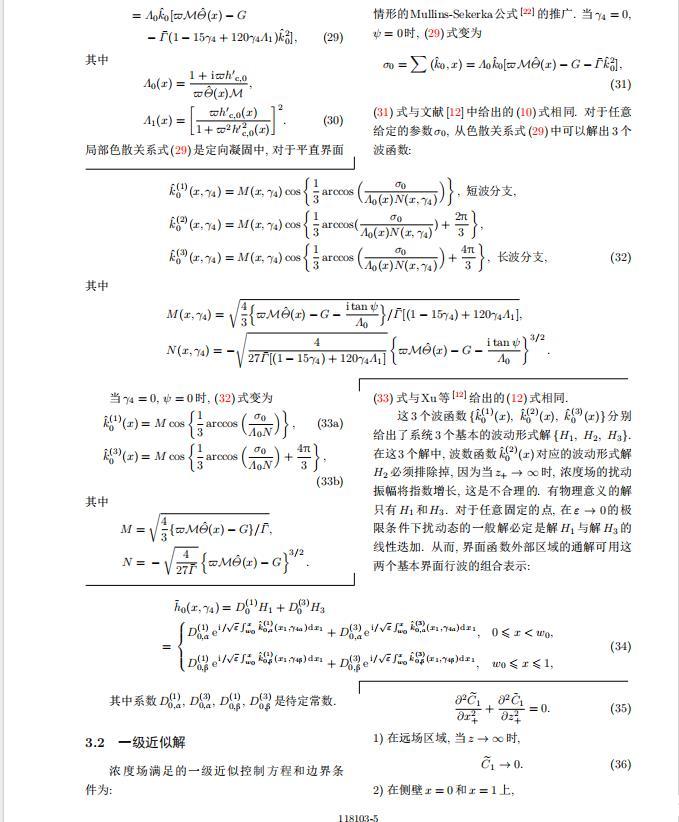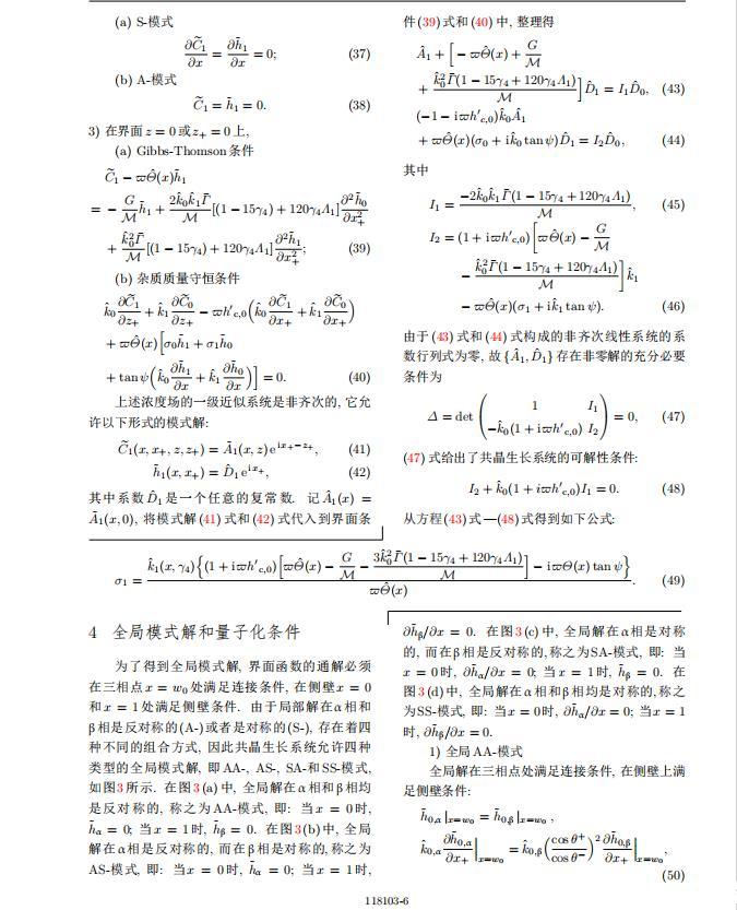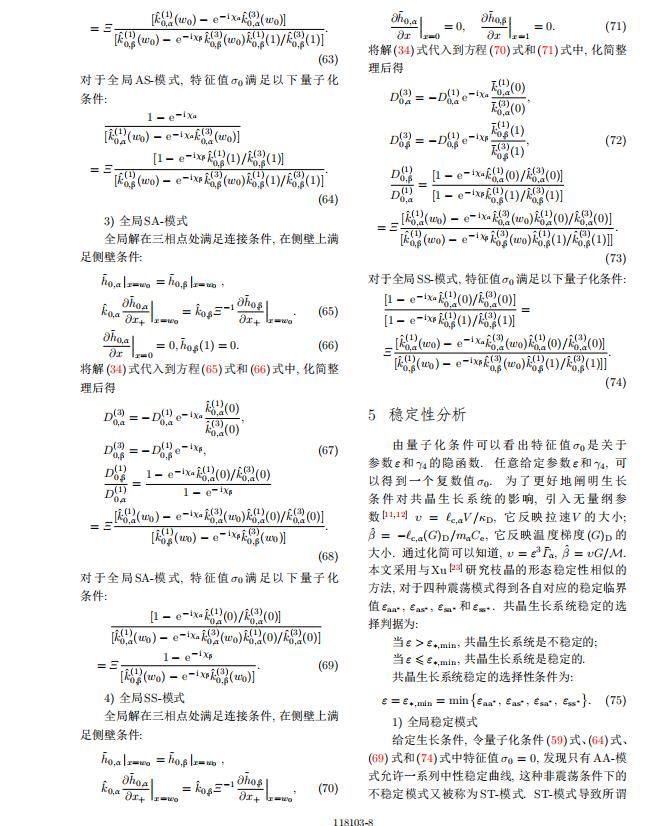 將系統(tǒng)方程以振幅遠小于1進行線性化處理,結合(1)式—(4)式,可以得到共晶生長系統(tǒng)的擾動態(tài)滿足以下控制方程和邊界條件: