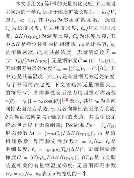 固體材料本身并非各向同性介質,其晶格結構使固體體內(nèi)的物理量以及表面的物理參數(shù)依賴于取向,變?yōu)楦飨虍愋粤?固體材料這些物理參量的各向異性特征對凝固過程動力學與界面穩(wěn)定性機理以至對界面微結構圖案的形成與選擇造成重要的影響[14].王志軍等[15,16]研究了各向異性表面張力對定向凝固過程中初始平界面穩(wěn)定性的影響,發(fā)現(xiàn)各向異性表面張力的非線性效應導致界面傾斜生長.Chen等[17]研究了各向異性表面張力對定向凝固過程中球晶生長的影響,發(fā)現(xiàn)在各向異性表面張力作用下,球晶生長初始階段部分界面首先向內(nèi)移動,達到一定的熔化深度后向外移動.Xu[18]研究了各向異性表面張力對定向凝固過程中枝晶生長的影響,發(fā)現(xiàn)當存在各向異性表面張力時,枝晶系統(tǒng)具有兩種不同的整體不穩(wěn)定性機理:震蕩不穩(wěn)定性與低頻不穩(wěn)定性.陳明文等[19]研究了各向異性表面張力對定向凝固過程中深胞晶生長的影響,發(fā)現(xiàn)當各向異性表面張力增大時,深胞晶界面全長增大,根部低端的曲率半徑增大.本文應用多重變量展開法研究各向異性表面張力條件下定向凝固共晶生長形態(tài)穩(wěn)定性,揭示了各向異性表面張力對共晶生長不穩(wěn)定性區(qū)域大小的影響.