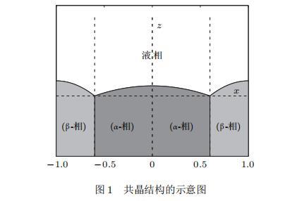 假設由α和β兩相組成的片層共晶以拉度V向液相穩(wěn)定推進,共晶片層與固-液界面垂直.選取固-液界面處α相片層的中心為坐標原點,x軸與片層垂直,z軸與晶體生長方向平行,如圖1所示.共晶界面用函數(shù)z=h(x,t)表示,它也是共晶生長解的一部分.