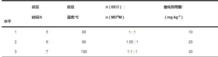 (1)以三氯化釕為催化劑,BEO和MDHM為原料,成功合成了目標(biāo)產(chǎn)物BEOTSS;采用正交試驗優(yōu)化了催化反應(yīng)條件:催化劑用量30 mg/kg,n(BEO)∶n(MDHM)為1.05∶1,反應(yīng)時間6.0 h,反應(yīng)溫度100℃,在此工藝條件下MDHM轉(zhuǎn)化率可達(dá)99%。
