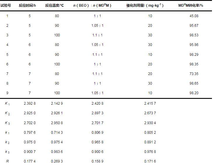 根據(jù)極差R的大小,確定各因素對反應(yīng)轉(zhuǎn)化率影響的大小順序為:反應(yīng)溫度B>反應(yīng)時間A>催化劑用量D>原料配比C。通過正交試驗結(jié)果確定釕催化合成工藝的最優(yōu)方案為A 2 B 3 C 2 D 3,即反應(yīng)時間6.0 h、反應(yīng)溫度100℃、n(BEO)∶n(MDHM)為1.05∶1、催化劑用量30 mg/kg。