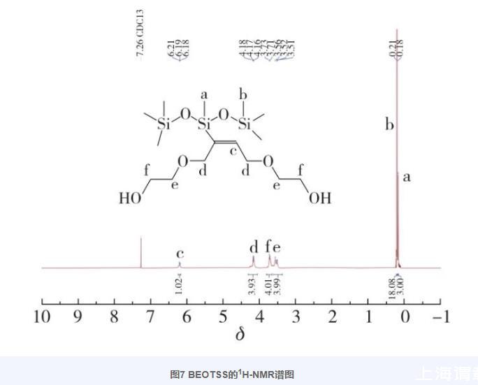 圖7為BEOTSS的1H-NMR譜圖。根據(jù)譜圖中的化學(xué)位移及積分?jǐn)?shù)據(jù)確定化合物中各基團(tuán)的氫歸屬,得到以下結(jié)果:1H-NMR(400 MHz,CDCl3),δ=6.24~6.16(m,—C=CH—,1H),4.17(m,—CH 2CCHCH 2—,4H),3.72(d,J=5.6 Hz,—CH 2—OH,4H),3.54(t,J=14.6 Hz,—O—CH 2—,4H),0.21(s,—Si(CH 3)3,18H),0.18(s,—SiCH 3,3H)。由于使用氘代氯仿作為溶劑,產(chǎn)物中的2個—OH為活潑氫,在譜圖中沒有出峰,同時結(jié)合紅外譜圖分析,進(jìn)一步證明本研究成功合成了目標(biāo)化合物BEOTSS。