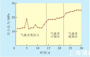 在氣液井底混合注入階段,當(dāng)氣液比為0.75∶1時(shí),1 d后注入壓力由氣液井口混合注入階段末期的20.3 MPa上升到22.9 MPa;當(dāng)氣液比升至1∶1,注入壓力進(jìn)一步升至25 MPa。