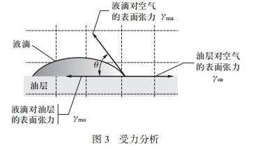 液滴爆炸現(xiàn)象的第二階段邊緣處的液滴產(chǎn)生液滴噴發(fā)現(xiàn)象,在該過程中液滴中部較厚的部分不斷向邊緣輸送液體,因此會(huì)穩(wěn)定持續(xù)一段時(shí)間。為解釋這一階段,先從表面張力入手,因?yàn)榻佑|角的不同,水對(duì)油的表面張力大于乙醇對(duì)油的表面張力,則混合液體對(duì)油層的界面張力介于水和乙醇之間?;旌弦旱沃幸掖嫉谋壤酱螅旌弦后w對(duì)油層的界面張力越小,受到向內(nèi)的張力減小,這樣整體向外的張力增大,這是產(chǎn)生向外推動(dòng)的驅(qū)動(dòng)力的重要原因。可見界面張力直接決定了液滴在界面上的擴(kuò)散和運(yùn)動(dòng)。
