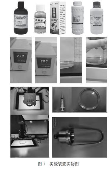 為了還原物理現(xiàn)象,初步探究液滴爆炸的原因,本文首先進(jìn)行了預(yù)實(shí)驗(yàn)。實(shí)驗(yàn)中所用到的物品包括:醫(yī)用75%酒精和蒸餾水混合形成水混合物液滴,家用菜籽油用作油池,普通藍(lán)墨水染色。在室溫環(huán)境下進(jìn)行實(shí)驗(yàn),預(yù)實(shí)驗(yàn)中發(fā)現(xiàn)普通藍(lán)墨水染色現(xiàn)象不明顯,改進(jìn)為采用甲基藍(lán)染色劑進(jìn)行染色。正式實(shí)驗(yàn)時(shí)準(zhǔn)備了不同種類的水混合物(乙醇、二乙二醇丁醚),不同種類的疏水性物質(zhì)(硅油、花生油、蓖麻油),不同厚度的疏水性物質(zhì)(5 mm、10 mm),設(shè)置合適的濃度梯度,采用恒溫水浴鍋來測定溫度。在顯微鏡下觀察液滴的運(yùn)動(dòng)過程,精準(zhǔn)測定液滴大小,利用注射器定量控制滴入液滴的體積,再利用黏度計(jì)測量黏性系數(shù),并對(duì)實(shí)驗(yàn)誤差進(jìn)行了修正。