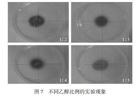 實驗5探究滴入液滴體積對液滴爆炸的影響,采用不同孔徑注射器,向高黏度蓖麻油油層上,滴入大液滴體積0.17 ml、小液滴體積0.08 ml的70%濃度的乙醇溶液,得到結論是:滴入更大的液滴會導致液滴爆炸總時間的延長和擴散半徑的增大。