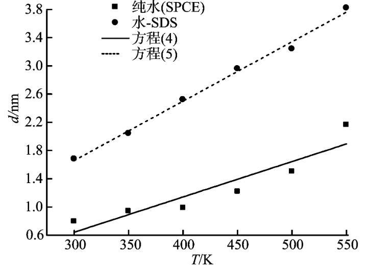 界面厚度取從水相體相密度的90%到表面活性劑體相密度的90%。模擬水分子數(shù)N1=3 000,十二烷基硫酸鈉數(shù)N2=20,在溫度T=300、350、400、450、500和550 K時,模擬得到界面厚度,將其與純水體系的界面厚度對比,如圖9所示。從圖9可以看出,水—表面活性劑體系的界面厚度隨溫度的增加而增加,而且和純水體系的界面厚度對比可知,水—表面活性劑體系的氣—液界面厚度明顯增大。同時,對純水體系和水—表面活性劑體系的界面厚度模擬值進行擬合可分別得到式(4)和(5)。