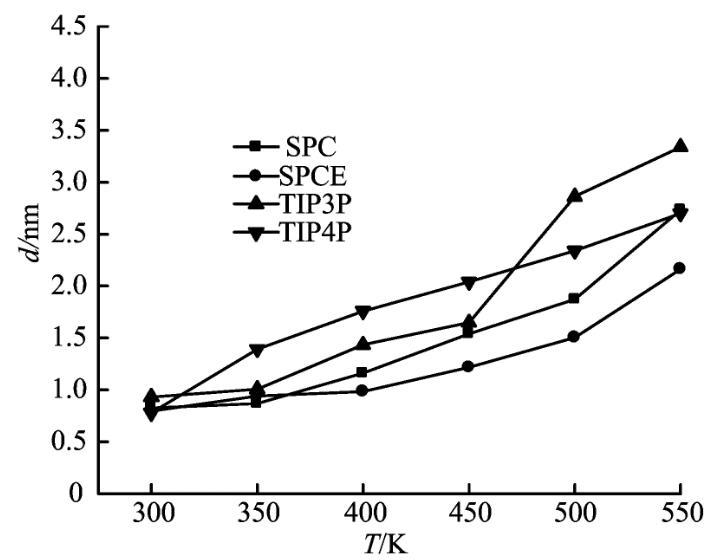 根據(jù)“10-90”法則進行計算,分別求得SPC、SPCE、TIP3P和TIP4P在300~550 K的界面厚度如圖6所示。