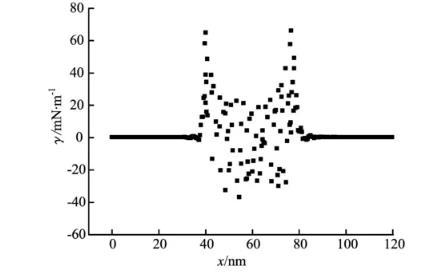 模擬水分子數(shù)N1=3 000,十二烷基硫酸鈉數(shù)N2=20,溫度T=300 K,水—表面活性劑體系的局部界面張力見圖10。由圖10可知,從汽相主體向液相過渡過程中,界面張力值逐漸增加,在氣—液界面區(qū)達到峰值;在液相主體又在零值附近波動。