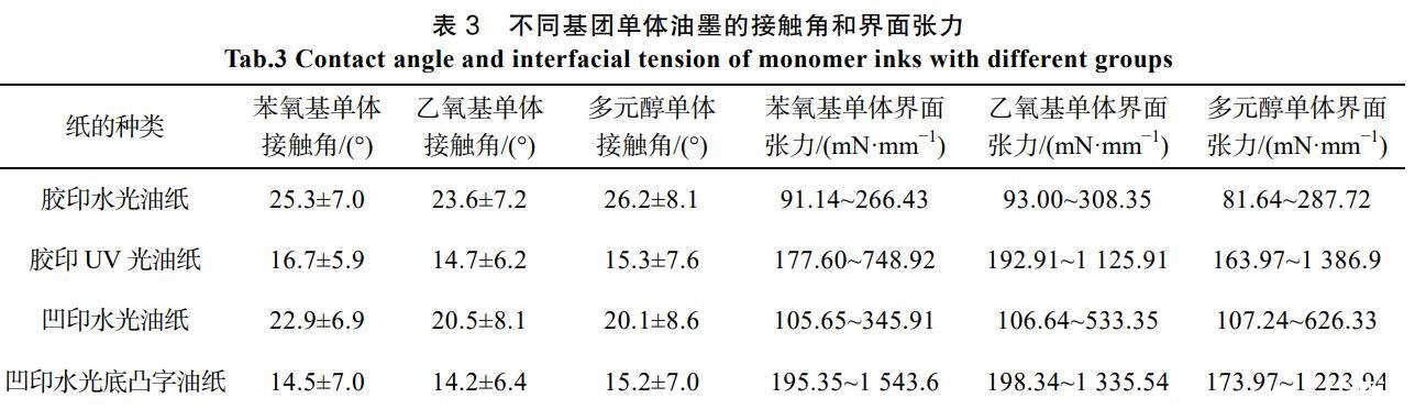表3不同基團單體油墨的接觸角和界面張力