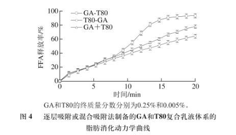 圖4逐層吸附或混合吸附法制備的GA和T80復(fù)合乳液體系的脂肪消化動力學(xué)曲線