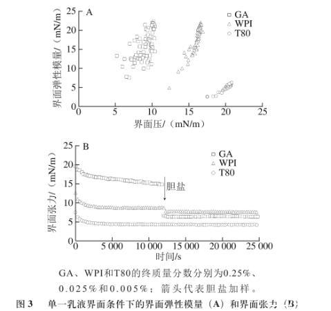 由圖3A可知,GA和WPI界面的彈性模量值基本一致,比T80界面的彈性模量值高很多。說明此質(zhì)量分?jǐn)?shù)條件下GA和WPI形成的界面相對T80有更好的界面黏彈性。這是由于大分子GA和WPI具有較強(qiáng)的空間位阻,在乳滴界面可形成較厚的吸附層,乳滴空間穩(wěn)定性較好,可在一定程度上抵御外力造成的變形。T80屬于小分子表面活性劑,在界面吸附致密整齊,但乳滴的空間穩(wěn)定性較差,易發(fā)生變形和聚集。圖3B表明,在加入膽鹽后,GA界面的界面張力降低值ΔT為8.42 mN/m,T80界面的界面張力基本不變,WPI界面的界面張力降低值ΔT為1.09 mN/m,由此證明T80的抗膽鹽取代能力最優(yōu),其次為WPI和GA。3種乳化劑所呈現(xiàn)的界面特性與3種乳液的消化動力學(xué)規(guī)律相吻合。采用界面流變技術(shù)可有效評價(jià)乳化劑的界面特性,腸液組分對乳滴界面特性造成的影響以膽鹽取代最為顯著。因此,通過評價(jià)膽鹽在界面的取代能力,可在一定程度上判斷乳液的脂肪消化動力學(xué)規(guī)律。