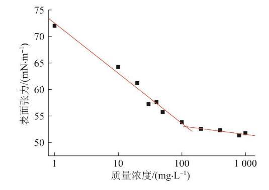 采用掛片法測量不同濃度h-PAMAM水溶液的表面張力(鉑片尺寸19.9 mm×10 mm×0.2 mm;精度0.01 mN/m)。不同濃度的h-PAMAM水溶液在室溫下的表面張力如圖2所示,由凝膠滲透色譜法(GPC)測得h-PAMAM的平均分子質(zhì)量為8 351 g/mol,并通過其計算了相關(guān)的熱力學(xué)參數(shù)。