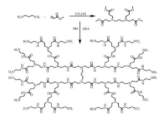 以1,3-丙二胺為反應(yīng)中心核,丙烯酸甲酯和乙二胺為支鏈,通過“一鍋法”合成h-PAMAM。具體的反應(yīng)過程可以分為以下幾步,首先將30 mL甲醇加入到三口燒瓶中,向其中加入1,3-丙二胺(0.1 mol),邊攪拌邊滴加丙烯酸甲酯(0.4 mol),隨后混合物在25℃下繼續(xù)攪拌反應(yīng)24 h。然后依次將乙二胺(0.28 mol)和丙烯酸甲酯(0.24 mol)滴加入燒瓶中,繼續(xù)反應(yīng)24 h。最后,在真空狀態(tài)下采用程序升溫:60℃反應(yīng)1 h,80℃反應(yīng)1 h,100℃反應(yīng)2 h,120℃反應(yīng)2 h,140℃反應(yīng)2 h。最終得到淺綠色、高黏度的樣品。合成路線如圖1所示。