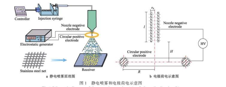 靜電噴霧裝置主要由高壓靜電發生器、控制器、微量注射器、噴嘴電極、環形電極和接收板組成,如圖1a所示。噴嘴電極連接高壓靜電發生器的負極,環形電極接高壓靜電發生器的正極。高壓靜電發生器輸出負高壓,在噴嘴電極會產生大量的負電荷,同時環形電極上會感應出正電荷。調節靜電發生器的參數,控制噴嘴電極和環形電極之間的電場強度。將微量注射泵固定在支架上,使用微量注射泵將溶液勻速泵送到噴嘴處。液體從噴嘴噴出時與高壓電極接觸,使電極上的電荷傳導到液體。帶電液體在靜電力、電荷互斥力、重力、環境復合力的作用下,破碎成細小液滴,并均勻地吸附在工件上。