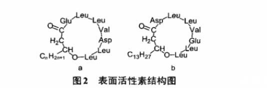 得到的脂肽先由氨基酸自動(dòng)分析儀獲得脂肽的氨基酸組成,然后用電噴霧四極桿~飛行時(shí)間串聯(lián)質(zhì)譜(ESI Q-TOF MS/MS)和氣相色譜/質(zhì)譜連用(GC/MS)對脂肽結(jié)構(gòu)進(jìn)行解析。