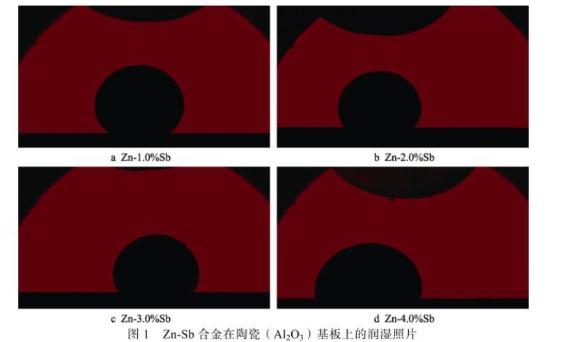 液態(tài)金屬表面張力是一個(gè)極為重要的物理化學(xué)性質(zhì),在液態(tài)金屬成形加工過(guò)程中,表面張力與金屬的流動(dòng)性及其與金屬基板間的潤(rùn)濕性密切相關(guān)。由于合金熔體與陶瓷的不潤(rùn)濕性,可以通過(guò)計(jì)算得到較準(zhǔn)確的合金熔體表面張力,并進(jìn)行不同Zn-Sb合金熔體在陶瓷(Al2O3)基板上的潤(rùn)濕實(shí)驗(yàn),圖1為實(shí)驗(yàn)條件下不同Zn-Sb合金熔體在陶瓷基板上的潤(rùn)濕照片。