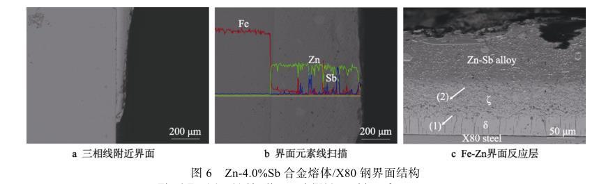 圖6c展示了經(jīng)硝酸酒精腐蝕后,Zn-Sb合金與X80鋼潤(rùn)濕的界面反應(yīng)產(chǎn)物層。利用EDS沿界面進(jìn)行定量檢測(cè),發(fā)現(xiàn)界面處存在一定量的Zn、Fe和極少量的Sb,Zn-Sb合金熔體與X80鋼發(fā)生反應(yīng)生成了鐵鋅化合物。能譜分析表明,圖6c中箭頭所示(1)、(2)處的含鐵量分別為8.30%和5.23%,為典型的δ(FeZn10)相和ζ(FeZn13)相,ζ層緊鄰Zn-Sb合金熔體,而δ層呈柵狀,位于ζ層的下方,這與徐其林等的研究結(jié)果一致。同時(shí)發(fā)現(xiàn),隨著Sb含量的增加,潤(rùn)濕反應(yīng)所形成的界面產(chǎn)物層并未發(fā)生顯著變化,說(shuō)明Sb元素的添加對(duì)Fe-Zn反應(yīng)基本沒(méi)有影響。