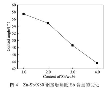 在實(shí)驗(yàn)過(guò)程中,鋅合金熔體在基板上的潤(rùn)濕時(shí)間很短,潤(rùn)濕體系會(huì)很快達(dá)到平衡,且鋅合金熔體中Sb元素的添加量很少,根據(jù)Fe-Sb二元相圖可知,在450℃滴落溫度下,F(xiàn)e與Sb之間的固溶度極小并無(wú)化合物生成,與X80鋼基板發(fā)生反應(yīng)的元素主要是Zn,可以認(rèn)為Sb添加對(duì)降低鋅液與X80鋼基體之間界面張力σsl的影響相對(duì)較小,由此Zn-Sb合金熔體與X80鋼基板之間的潤(rùn)濕角主要取決于鋅合金熔體的表面張力σlv,表面張力σlv越小,接觸角越小,即鋅合金熔體與X80基板之間的潤(rùn)濕性越好。